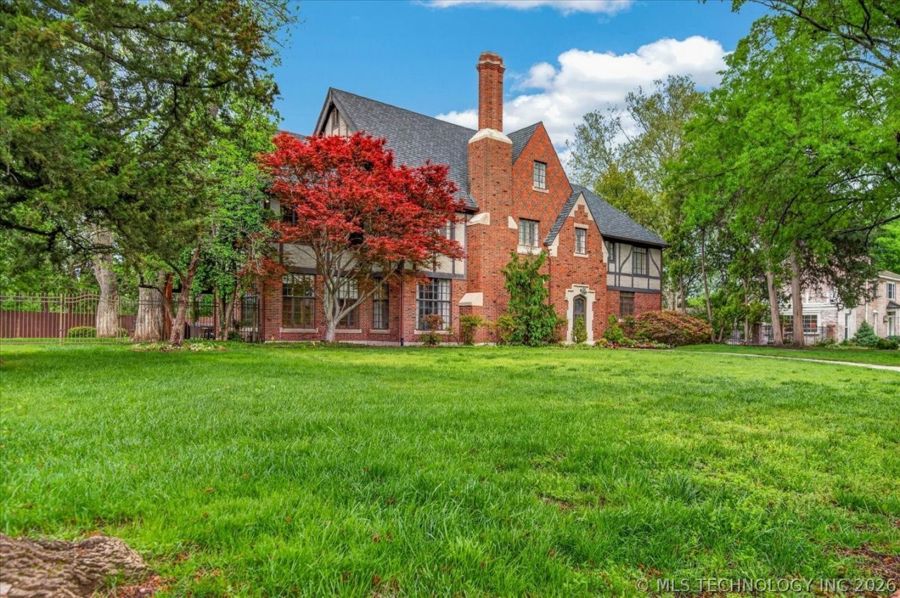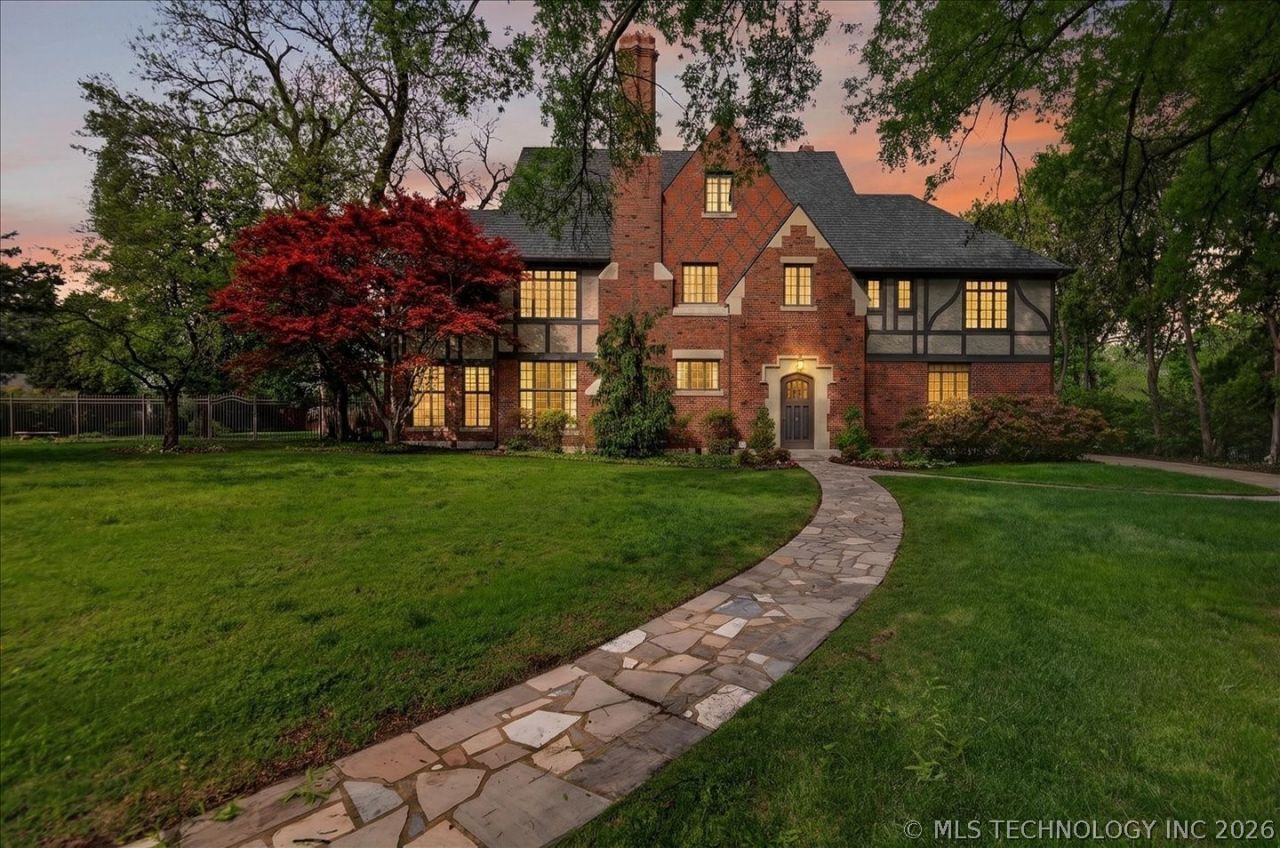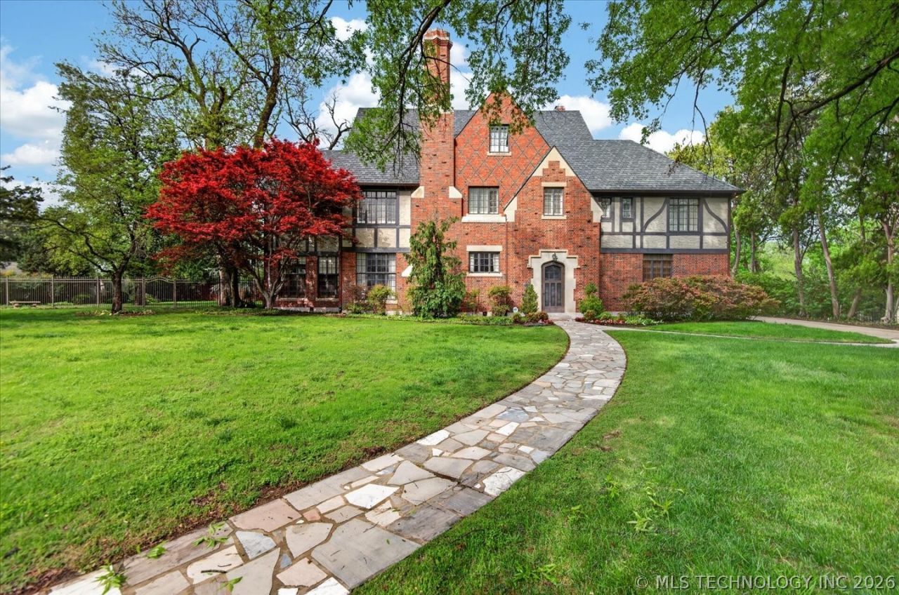 Stunning Tudor-style home in the heart of Bartlesville! This beautifully maintained property offers timeless character, gorgeous curb appeal, and an inviting blend of original charm and modern updates. Inside, you'll find multiple spacious living areas, beautiful hardwood floors, rich woodwork, elegant lighting, and abundant natural light throughout. The kitchen features crisp white cabinetry, SS countertops, SS appliances, subway tile backsplash, and charming black-and-white flooring that perfectly complements the home's classic style. The spacious primary suite provides a relaxing retreat with a large sitting area and beautifully updated bath. Generously sized secondary bedrooms, updated bathrooms, and flexible living spaces provide room for everyone. Enjoy cozy evenings in the wood-paneled den, entertain in the formal dining room, or relax in the light-filled living spaces full of warmth and character. Situated on a beautifully landscaped lot with mature trees, striking brick exterior, and stone walkway, this Delaware beauty is truly one-of-a-kind. Don't miss your chance to own a home full of charm, space, and timeless appeal!