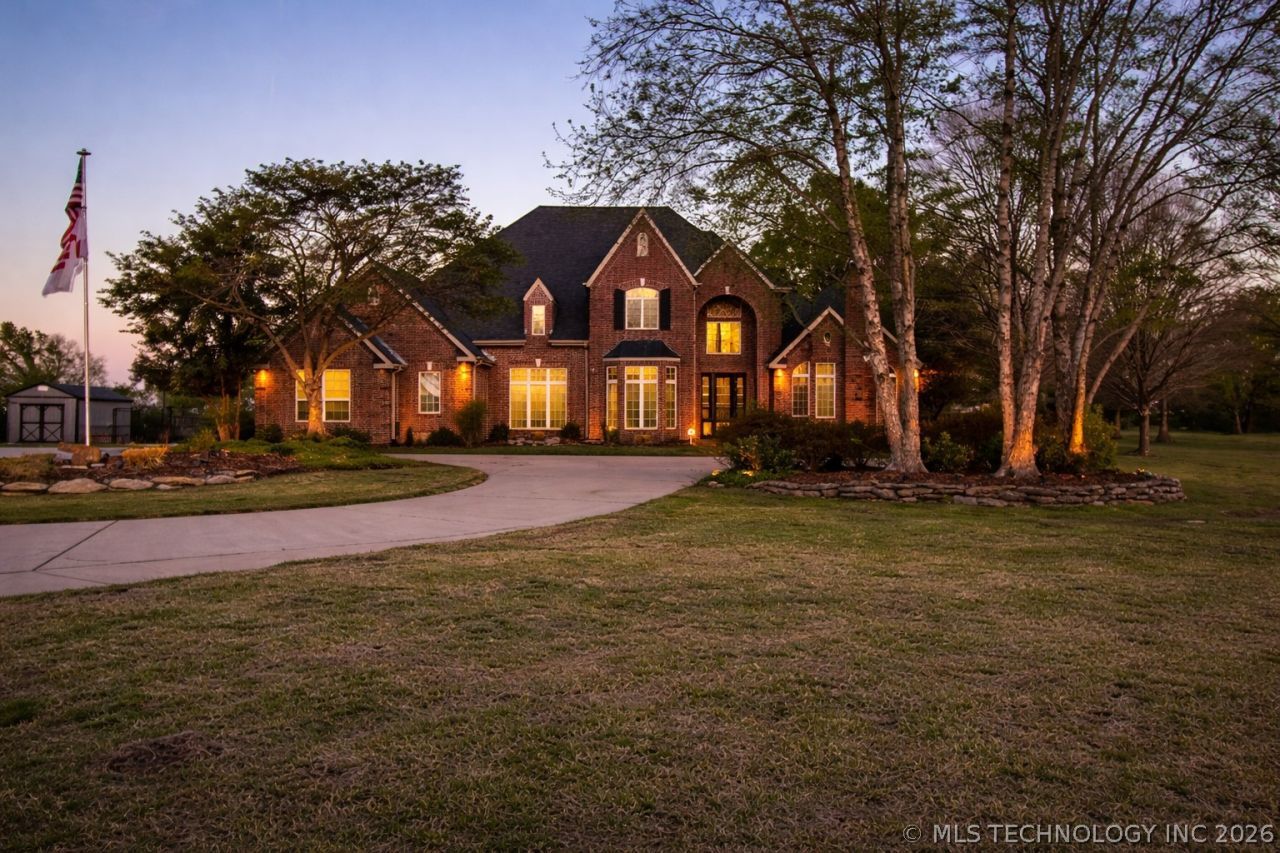 Private estate nestled on 5 pristine acres with mature trees at the end of a quiet cul-de-sac. This full-brick home offers 4 bed 3.5 bath, bonus room that could be used as fifth bedroom Step inside to a grand entryway featuring soaring ceilings & a sweeping curved staircase. An arched walkway leads into the inviting family room, complete with custom built-ins, cozy wood-burning fireplace and expansive backyard views. The gourmet kitchen is updated with painted cabinetry, a motion-sensing faucet, large island with warming tray. Newer KitchenAid appliances including refrigerator, 5-burner gas cooktop, double ovens, dishwasher & trash compactor. Second sink area with reverse osmosis system & beverage cooler creates the perfect coffee/beverage bar. Breakfast nook offers space for casual dining, while a hidden second staircase gives convenient access to the upstairs. Tucked discreetly beneath is a built-in safe room adds peace of mind. Formal dining room has been elevated with rich, moody paint and a designer chandelier, creating an intimate space for gatherings. Formal living room with vaulted, beamed ceilings & a dedicated office featuring built-in bookshelves with drawers/cabinet storage. Master suite is a true retreat, offering a sitting area & a spa-inspired bath with double sinks, walk-in shower, and Kohler jetted tub. The large walk-in closet features built-in dresser & tons of shelving for all accessories. Upstairs 3 bedrooms, 2 full bathrooms & bonus room ideal for a home theater/game room/fitness space. Large walk-out floored attic right above the oversized 3-car garage with cabinetry double sink. Outside, enjoy beautifully landscaped grounds with landscape lighting, sprinkler system, hot tub, 10x20 storage shed. Home includes security/camera system, Class 4 impact-resistant roof 2021, 2 new A/C units 2021, home audio system, new downstairs carpet, new wall/trim/door paint designer lighting. Experience peaceful quiet country living just minutes from town!