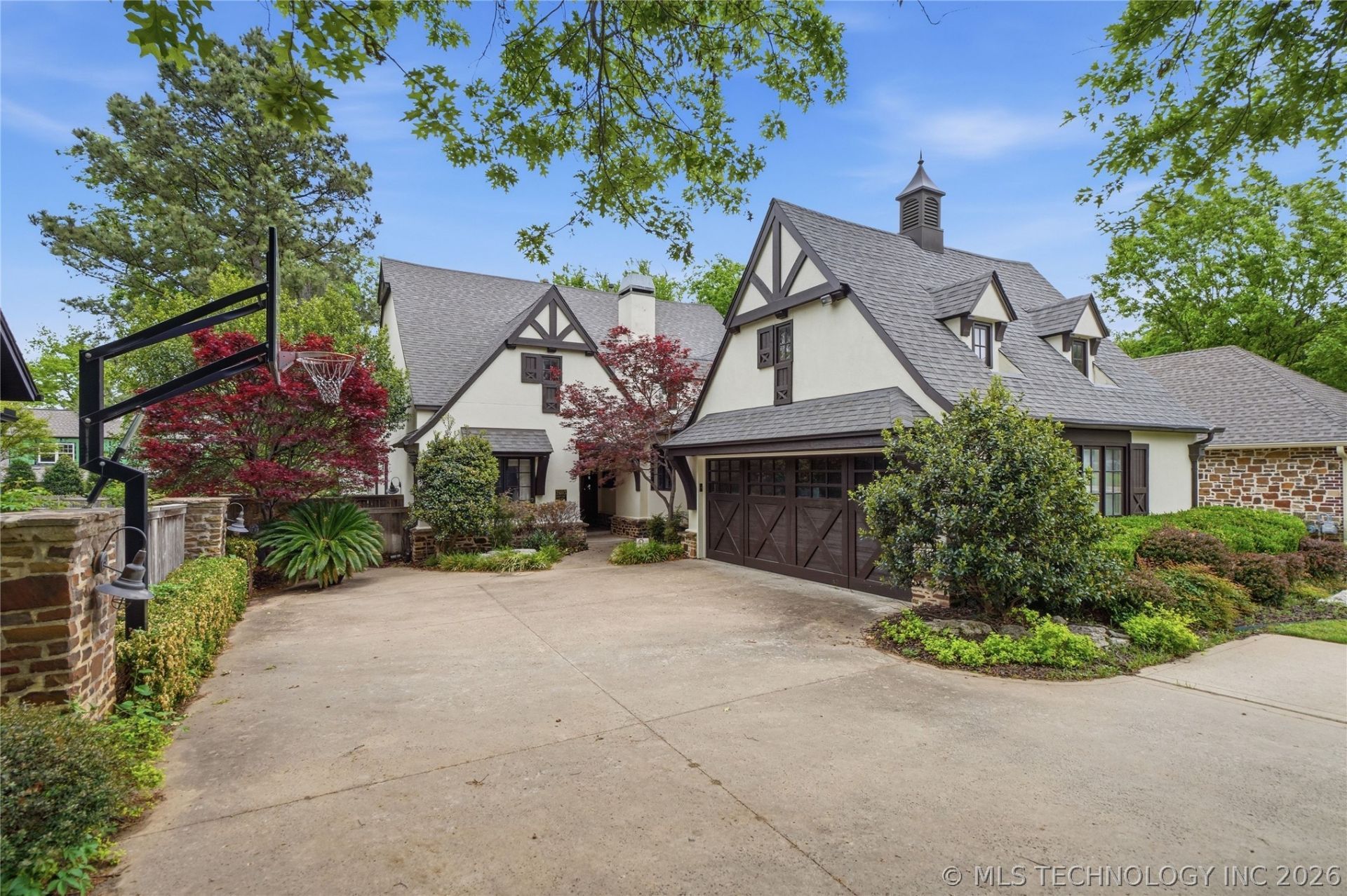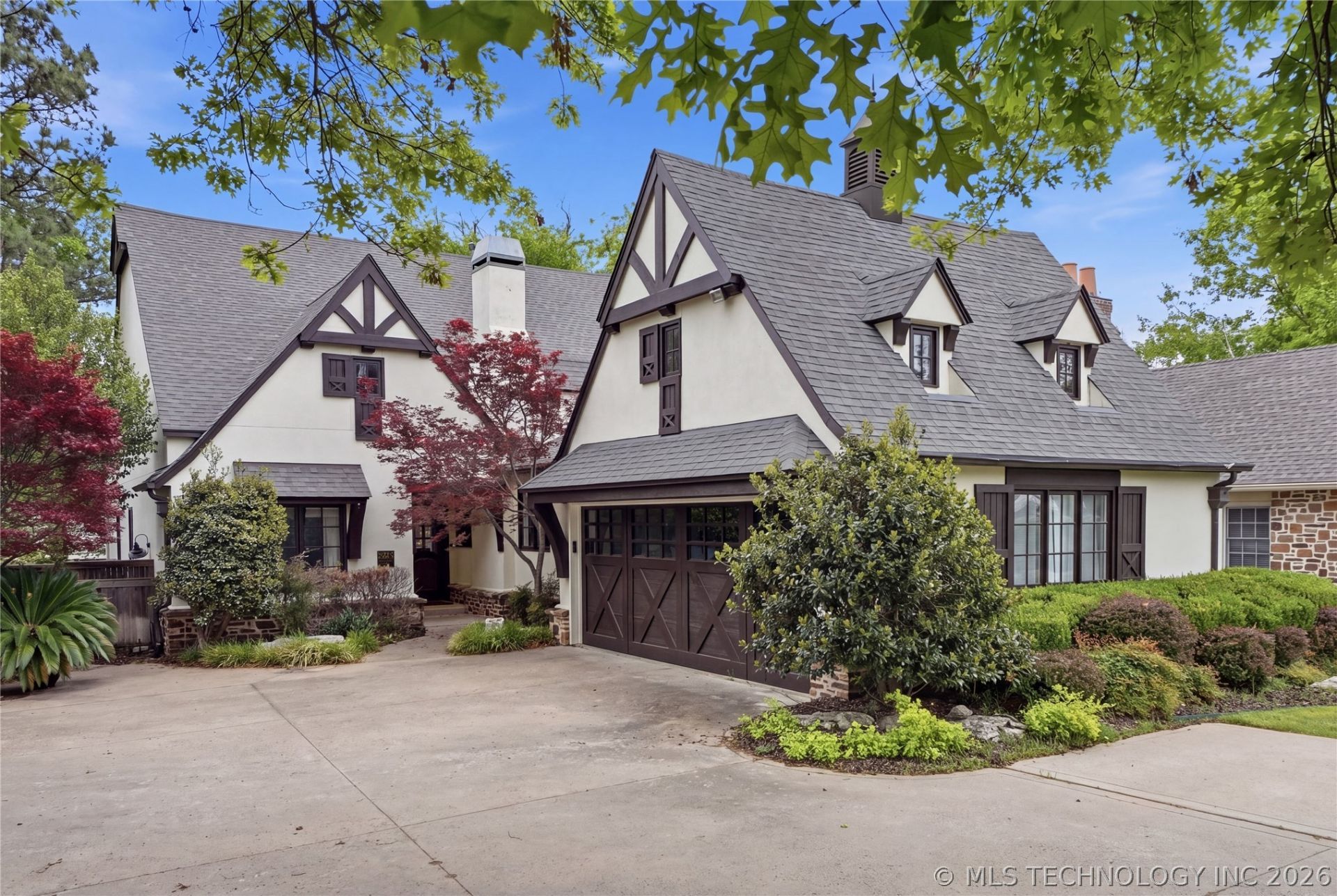Lovely English-style home near Utica Square, St. John Hospital, Monte Cassino School, and Cascia Hall. This home offers many, charming design details and updates inside and out. NEW ROOF SPRING 2026. Spacious great-room with beamed, and cathedral ceiling, cast-stone fireplace. Vaulted kitchen and sitting area with stacked stone fireplace, plus walk-in pantry. First floor primary suite, plus guest bedroom or office with vaulted ceilings and wood-stained, paneled walls. Two additional bedrooms and gameroom with built-ins upstairs. Hardwood flooring throughout. Beautiful and private outdoor setting with terraced flagstone patios, covered patio, fireplace, gunite pool and spa.