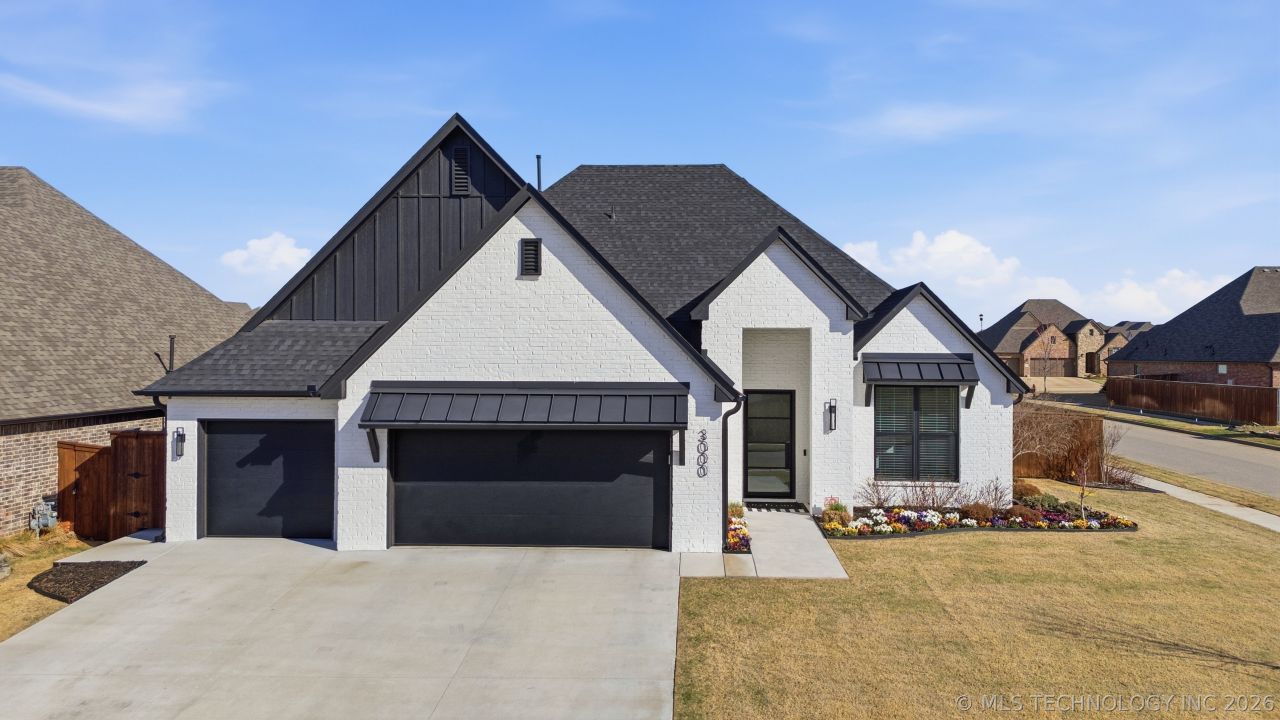 This beautifully custom-built, meticulously maintained corner-lot home offers exceptional craftsmanship and a highly-functional layout. Features include a striking 4x8 Iron Envy black iron front door, hand scraped white oak hardwood floors, wood beams, and a custom hand-welded iron staircase. The open living area showcases a floor-to-ceiling procelain-tile fireplace with 42" ventless logs and built-ins, flowing into a chef's kitchen with Palermo Quartz surfaces, marble-design backsplash, Frigidaire Gallery appliances, and a walk-in pantry with coffee bar, window, and sink. The main level includes the primary suite plus two additional bedrooms, and the primary bath offers double vanities with LED mirrors, a free-standing tub, porcelain-tiled walk-in shower, and dual walk-in closets. Additional highlights include a whole-house water filtration system, mudroom, utility room with granite countertops and sink, and a powder bath with polished marble hex tile, granite, and an LED mirror. The insulated 3 car garage has polyaspartic flooring and Wi-Fi openers. Upstairs offers a versatile fourth-bedroom or exercise room with full bath, walk-in closet, and walk-out storage. An extended covered patio with double ceiling fans, Generac generator, professional landscaping, and neighborhood pool access complete this outstanding property. Located in Broken Arrow schools with convenient access to highways, shopping and dining. This house has too many upgrades to list and is a must see! Schedule your showing today!