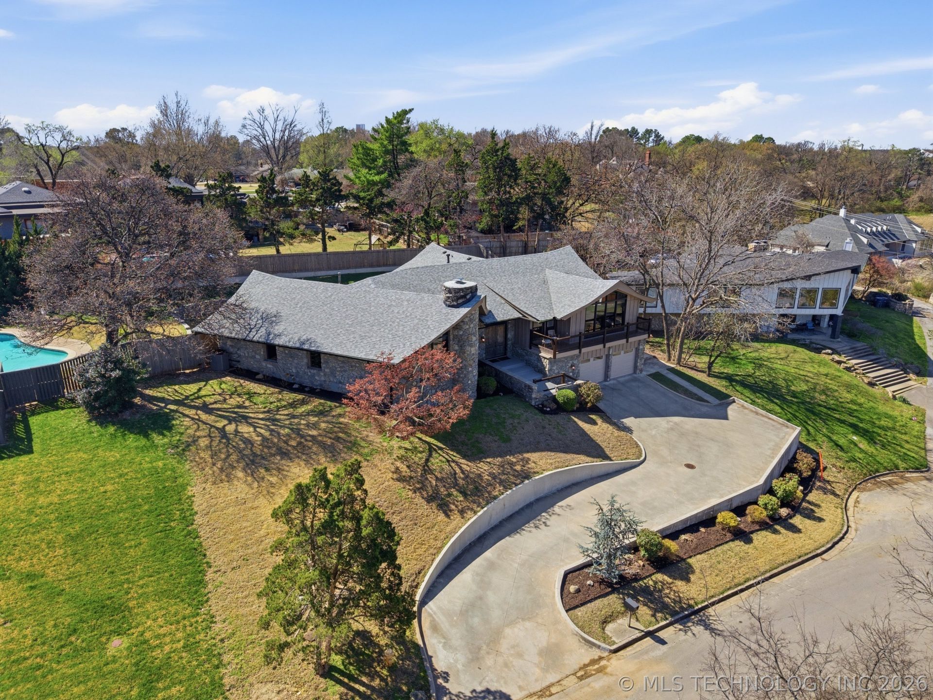 Don't miss this South Tulsa beauty located near Southern Hills Country Club! This 4-bedroom, 3.5 bath beauty offers soaring vaulted and beamed ceilings, open living/dining with a stately stone fireplace, floor-to-ceiling windows, and exceptional views of Tulsa. The chef's kitchen features a large island, tons of counter space, double ovens, and a five-burner gas cook top, loads of storage, a wine fridge, and a unique corner sink overlooking the back yard. The main floor primary suite easily accommodates king-size furniture and features a private deck that is perfect for morning coffee, along with a private spa bath including double vanities, a jetted tub, and a dual head shower. Downstairs, you will find an additional private suite ready to accommodate your guests comfortably. The large backyard includes a massive Moisture Shield composite deck with plenty of entertaining space. All of this with NO HOA! See it today!